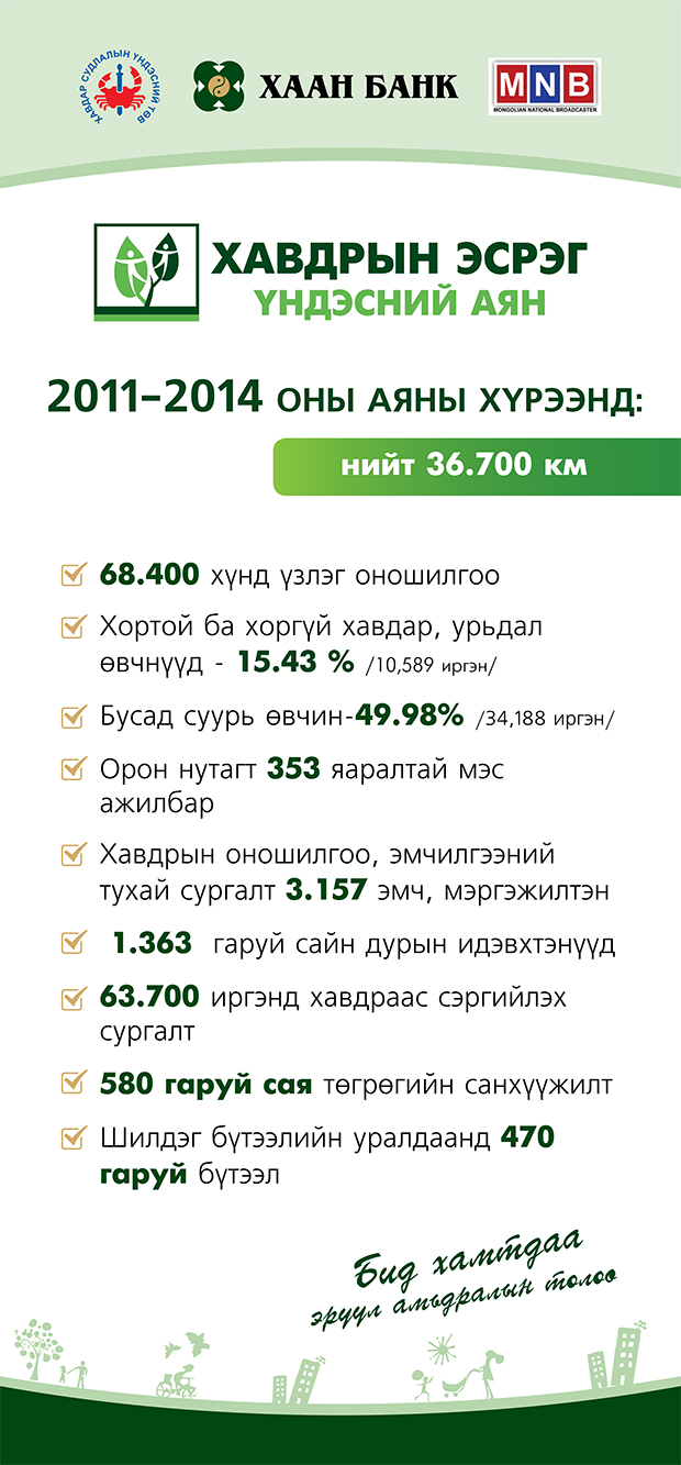 Хавдар өвчинтэй эрчимтэй тэмцэж, урьдчилан сэргийлэх арга хэмжээ авах, Монгол хүний эрүүл мэнд, ирээдүйн сайн сайхны төлөө дорвитой томоохон ажил өрнүүлэх зорилгоор 2011 онд ХААН Банк Сан, Хавдар судлалын үндэсний төв /ХСҮТ/, МҮОНРТ хамтран “Хавдрын эсрэг үндэсний аян”-г хэрэгжүүлж эхэлсэн билээ.