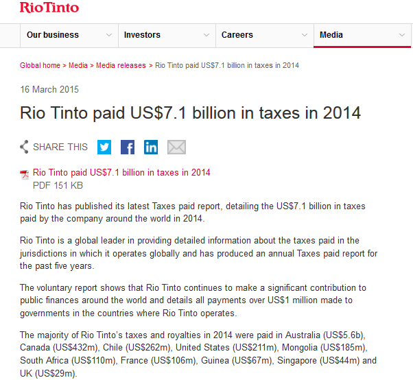 Мөн онд Австралид 5.6 тэрбум, Канадад 432, Чили 262, АНУ 211, ӨАБНУ 110, Франц 106, Гвиней 67, Сингапур 44, Их Британи 29 сая ам.долларын татвар төлжээ. Ингэснээр тус компанийн 2014 онд дэлхийн хэмжээнд нийт төлсөн татвар 7.1 тэрбум ам.доллар болж байгаа аж. "Рио Тинто" компани нь энэхүү “Татвар төлөлтийн тайлан”-гаа тав дахь жилдээ гаргаж байгаа бөгөөд өөрийн үйл ажиллагаа явуулж буй улс орнуудад нэг сая ам.доллараас дээш хэмжээгээр төлсөн татварын дүнгээ ийнхүү сайн дураараа мэдээлдэг уламжлалтай юм байна.