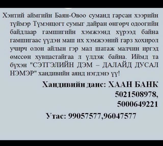 Аймгийн Засаг дарга Ж.Батсуурь, Баруун-Урт сумын Засаг дарга М.Идэрбат нараар ахлуулсан хамтарсан ажлын хэсэг Түмэнцогт суманд түймэрт өртсөн айл өрх, ард иргэдэд сэтгэл санааны болон эд материалын дэмжлэг үзүүлэн ажиллаж байгаа бөгөөд нутгийн уугуул иргэд, нутгийн зөвлөлийнхөн түймэрт өртсөн малчид, ард иргэдэд дэмжлэг үзүүлэх хандивын аян өрнүүлээд байгаа юм.