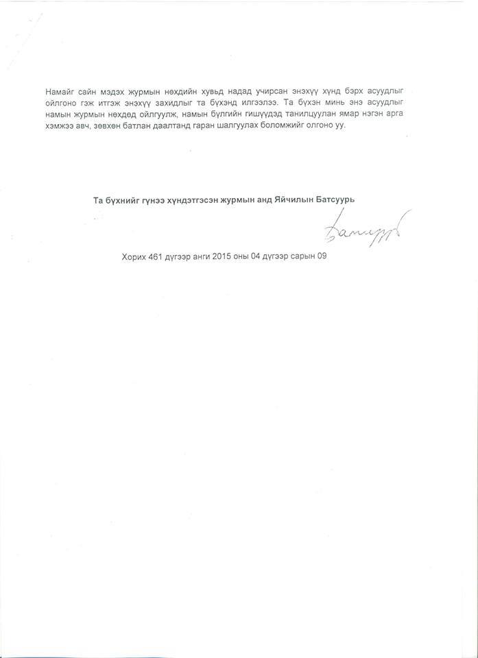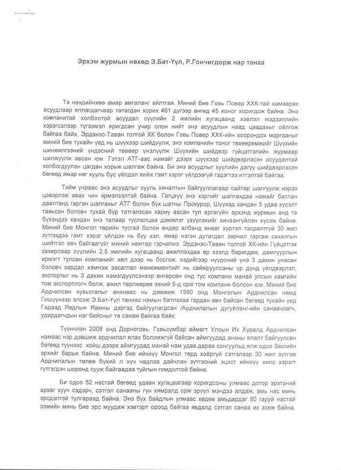 “Эрдэнэс Тавантолгойн”-н гүйцэтгэх захирлаар 2.5 жил ажиллаж байсан Я.Батсуурь Говь Повер ХХК-тай холбогдох хэргээр ял эдэлж байгаа билээ. Тэрбээр энэ сарын 9-ний өдөр журмын нөхөд болох Э.Бат-Үүл, Р.Гончигдорж нарт захидал илгээж, энэ талаар УИХ дахь АН-ын бүлгийн хуралдаанаар хэлэлцжээ. Тэрбээр захидалдаа өөрийгөө ямар нэг хууль бус үйлдэл хийгээгүй гэдгээ хэлж, хилс хэрэгт гүтгэгдсэн гэдгээ дурдсан байна. Түүнчлэн өөрийнх нь биеийн байдал муу байгаа учраас намын бүлгийн болон журмын нөхөд ямар нэг арга хэмжээ авч өгнө үү хэмээжээ.