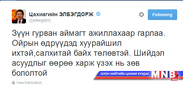 Монгол Улсын Ерөнхийлөгч Ц.Элбэгдорж Дорнод, Хэнтий, Сүхбаатар аймагт ажиллахаар өнөө өглөө мордлоо. Тэрбээр энэ долоо хоногийг дуустал зүүн гурван аймагт ажиллах юм.