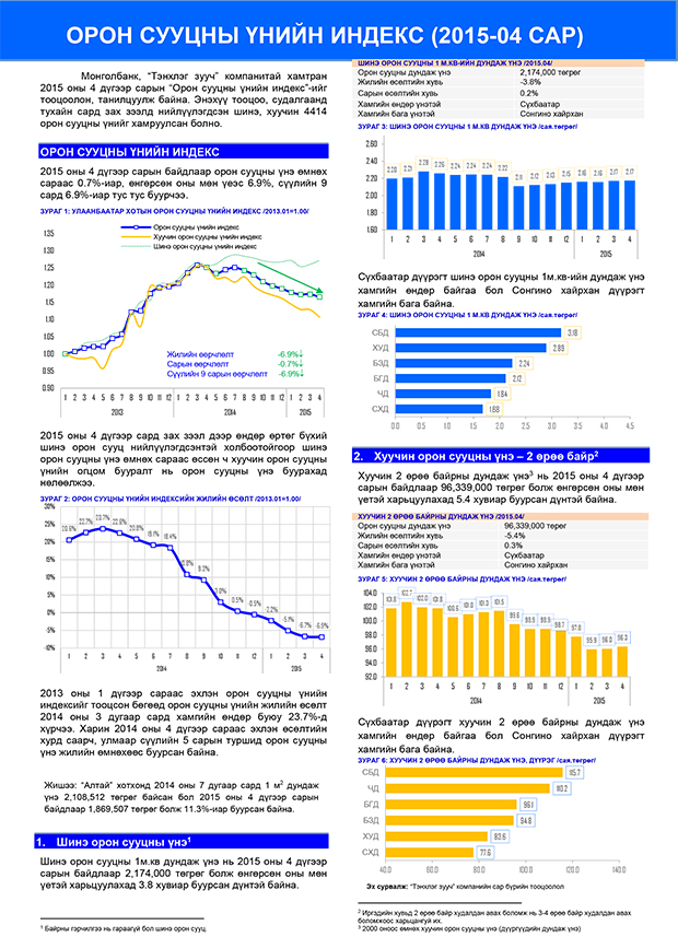 Монголбанкны захиалгаар Үл хөдлөх хөрөнгийн Тэнхлэг зууч компанийн хараат бусаар хийсэн 2015 оны дөрөвдүгээр сарын “Орон сууцны үнийн индекс”-ийн (ОСҮИ) судалгааг олон нийтэд танилцуулж байна.