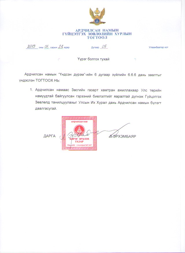 Ардчилсан намын Гүйцэтгэх зөвлөлөөс гаргасан тогтоолд улс төрийн намуудтай байгуулсан гэрээний биелэлтийг дүгнэх хэмээн бичсэн хэдий ч энэ нь хамтарсан намууд дунд олонхийг бүрдүүлж байгаа МАН-д хамааралтай асуудал гэдгийг эх сурвалжууд хэллээ.