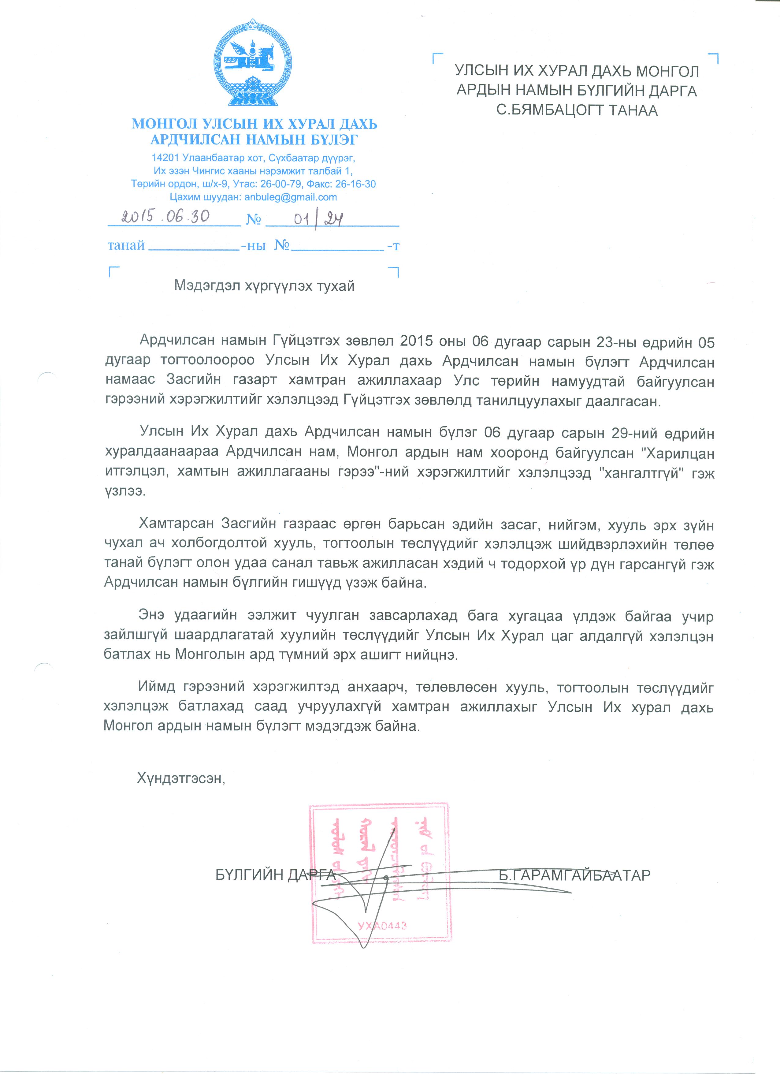 Харин дөнгөж сая УИХ дахь АН-ын бүлгээс МАН-ын бүлэгт Мэдэгдэл хүргүүлжээ. Тус мэдэгдэлд МАН-тай хамтарсан Засгийн газар байгуулсан гэрээний биелэлтийг “хангалтгүй” гэж дүгнэснээ дурдаад цаашид энэ оны ээлжит чуулганы хугацаа завсарлах хүртэл гэрээнд заасан хууль, тогтоолын төслүүдийг хэлэлцэж батлахад саад учруулалгүй хамтарч ажиллахыг дурджээ. Уг мэдэгдлийг МАН-ын бүлэгт хүргүүлсэн бөгөөд одоогоор ямар нэг хариу ирүүлээгүй байгаа юм байна.