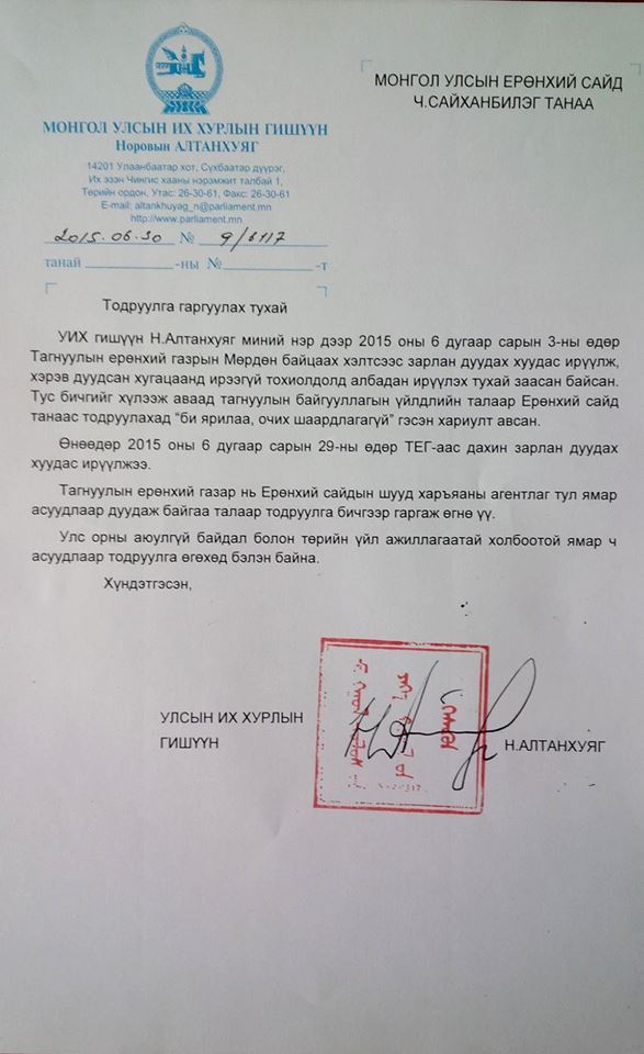 УИХ-ын гишүүн Н.Алтанхуяг өчигдөр Ерөнхий сайд Ч.Сайханбилэгт хандаж тодруулга хүсчээ. Тэрбээр тодруулга хүсэх тухай бичигтээ “УИХ-ын гишүүн Н.Алтанхуяг миний нэр дээр 2015 оны зургаадугаар сарын 3-ны өдөр Тагнуулын Ерөнхий газрын Мөрдөн шалгах хэлтсээс зарлан дуудах хуудас ирүүлж, хэрэв дуудсан хугацаанд ирээгүй тохиолдолд албадан ирүүлэх тухай заасан байсан. Тус бичгийг хүлээж аваад тагнуулын байгууллагын үйлдлийн талаар Ерөнхий сайд танаас тодруулахад “Би ярилаа, очих шаардлагагүй” гэсэн хариулт авсан. Өнөөдөр 2015 оны зургаадугаар сарын 29-ний өдөр ТЕГ-аас дахин зарлан дуудах хуудас ирүүлжээ. Тагнуулын Ерөнхий газар нь Ерөнхий сайдын шууд харьяаны агентлаг тул ямар асуудлаар дуудаж байгаа талаар тодруулга гаргаж өгнө үү” гэсэн байна.