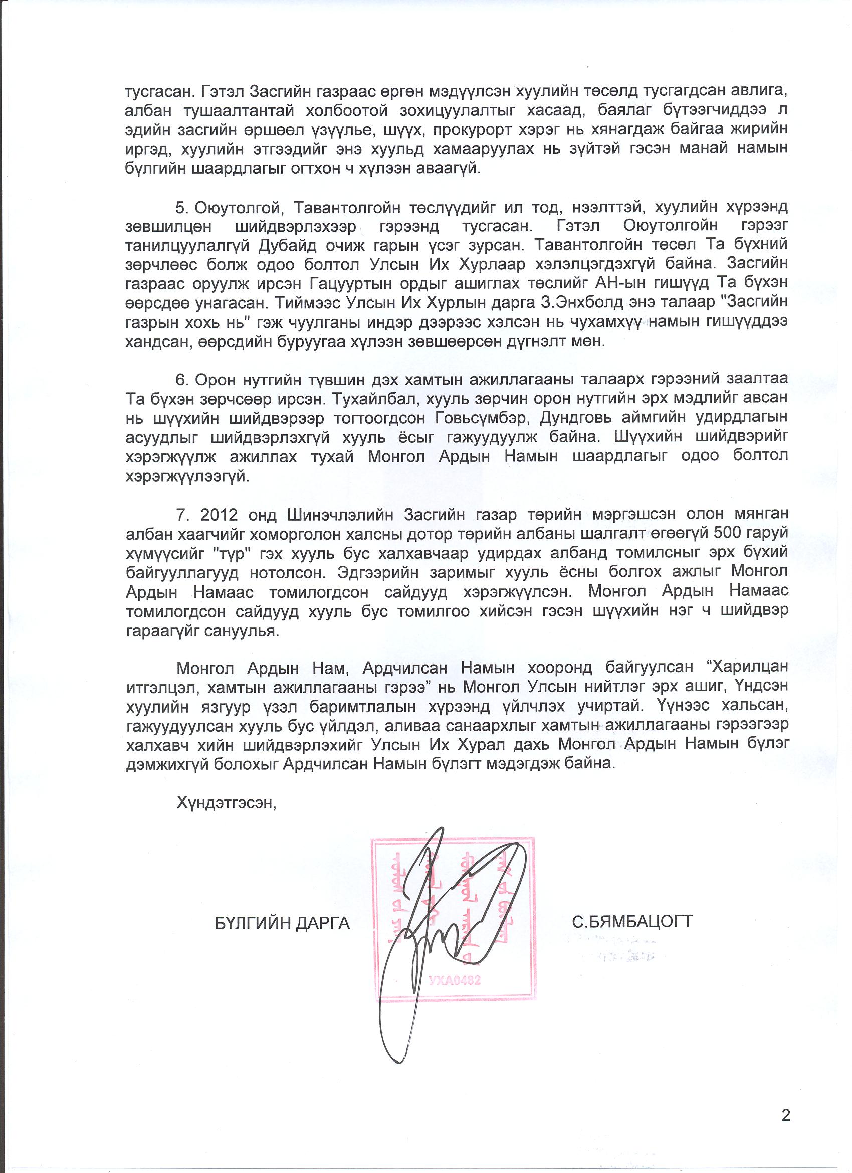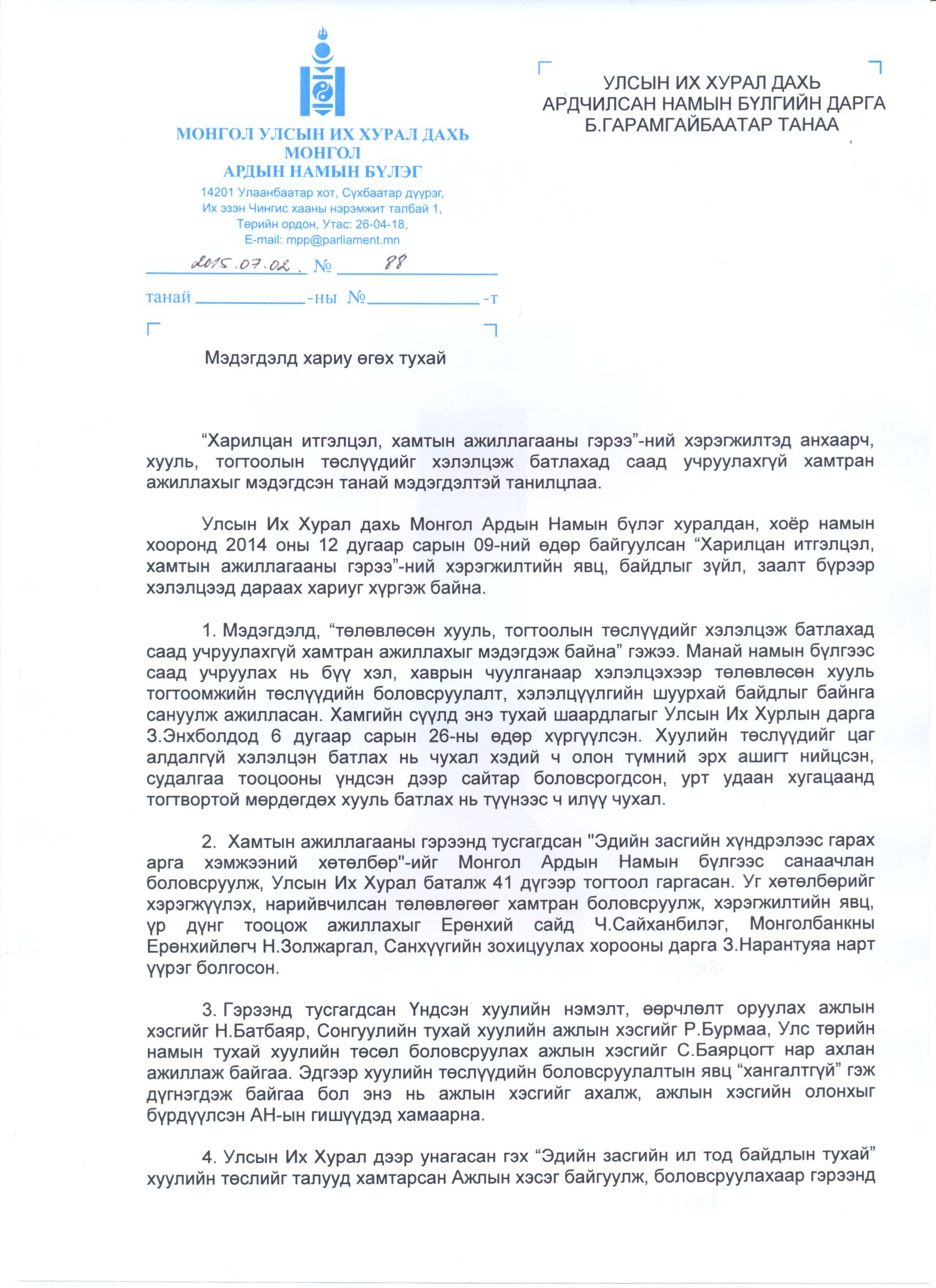 Үүний дараа УИХ дахь АН-ын бүлгээс МАН-ын бүлэгт мэдэгдэл хүргүүлж гэрээнд заасан хуулиудыг батлахад саад учруулахгүй байхыг анхааруулсан. Харин дөнгөж сая УИХ дахь МАН-ын бүлгээс уг мэдэгдэлд хариу өгчээ. Хариу мэдэгдэлд хоёр намын хооронд байгуулсан “Харилцан итгэлцэл, хамтын ажиллагааны гэрээ”-ээр халхавчилж аливаа хууль гажуудуулсан үйлдэл хийхийг МАН-ын бүлэг дэмжихгүй гэдгээ мэдэгдсэн байна.