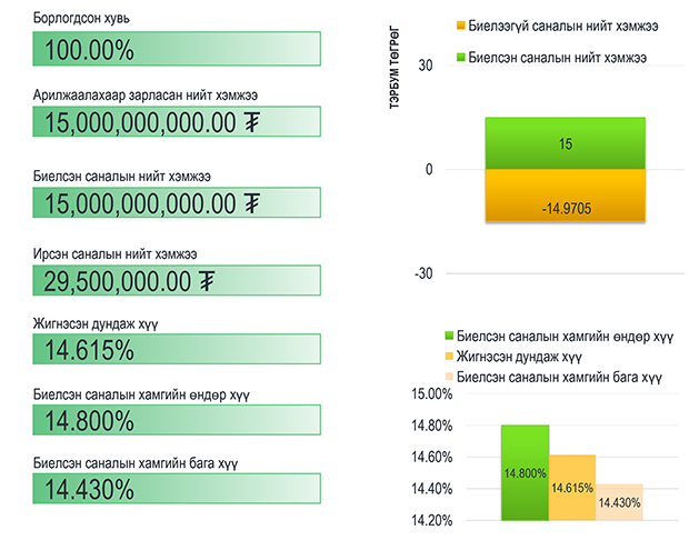 Засгийн газрын үнэт цаас /ЗГүЦ/-ны ээлжит арилжаагаар 1 сая төгрөгийн нэрлэсэн үнэ бүхий 52 долоо хоногийн хугацаатай 15.0 тэрбум төгрөгийн арилжаалахаар нийтэд мэдээлсэн бөгөөд нийт 29.5 тэрбум төгрөгийн ЗГүЦ худалдан авах санал ирж, 15.0 тэрбум төгрөгийн Засгийн газрын хямдруулсан үнэт цаасыг 14.615 хувийн жигнэсэн дундаж хүүтэйгээр арилжааллаа гэж Моннголбанкнаас мэдээллээ.