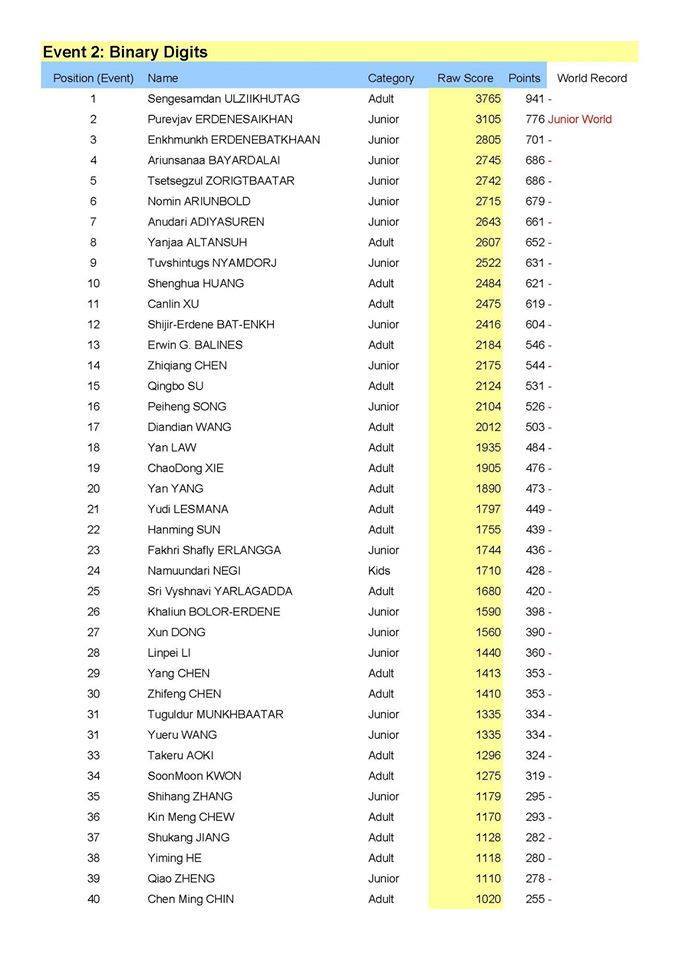Ой тогтоолтын Азийн аварга шалгаруулах тэмцээнд Монголын оюун ухааны академийн тамирчид амжилттай оролцож байна. Наймдугаар сарын 22-ны байдлаар Монгол Улсын тамирчид таван алт, есөн мөнгө, таван хүрэл медалийн болзол хангаж нийт 19 медаль хүртжээ. Тэмцээний хоёр дахь төрөл болох “Хоёртын тоолол” буюу 30 минутад хамгийн олон цифр тогтоон алдаагүй санах төрөлд амжилттай оролцсон тамирчдын оноог жагсаахад эхний есөн байрт манай тамирчид жагссан байна. Мөн энэ төрөлд олон улсын мастер, 16 настай Э.Пүрэвжав өсвөрийн насны ангилалд дэлхийн дээд амжилтыг шинэчлэн тогтоосон бөгөөд өмнө нь эзэмшиж байсан их мастер Б.Намуунтуулын 2970 цифр цээжилж алдаагүй санасан амжилтыг эвдэж 3105 цифр болгожээ.