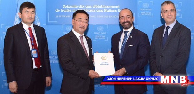 2015 оны есдүгээр сарын 28-ны өдөр Гадаад хэргийн сайд Л.Пүрэвсүрэн "Хүүхдийн эрхийн тухай конвенцийн мэдээлэл хүргүүлэх журмын тухай нэмэлт протокол" болон "Мөнгөн усны тухай Минаматагийн конвенц"-ийг соёрхон баталсан тухай Ерөнхийлөгчийн Батламж жуух бичгийг НҮБ-ын Хууль эрх зүйн албанд гардуулж өгөв.