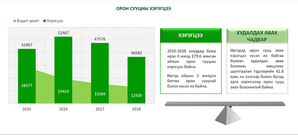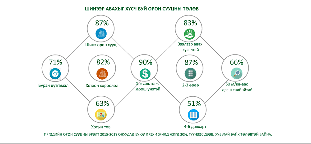 Түүнчлэн иргэд орон сууц авах хэрэгцээ хүсэл их байх боловч худалдан авах нөхцөл байдлаасаа шалтгаалан 42.8 хувь нь зээлээр болон бусад арга хэрэгслээр орон сууц авах ажээ.