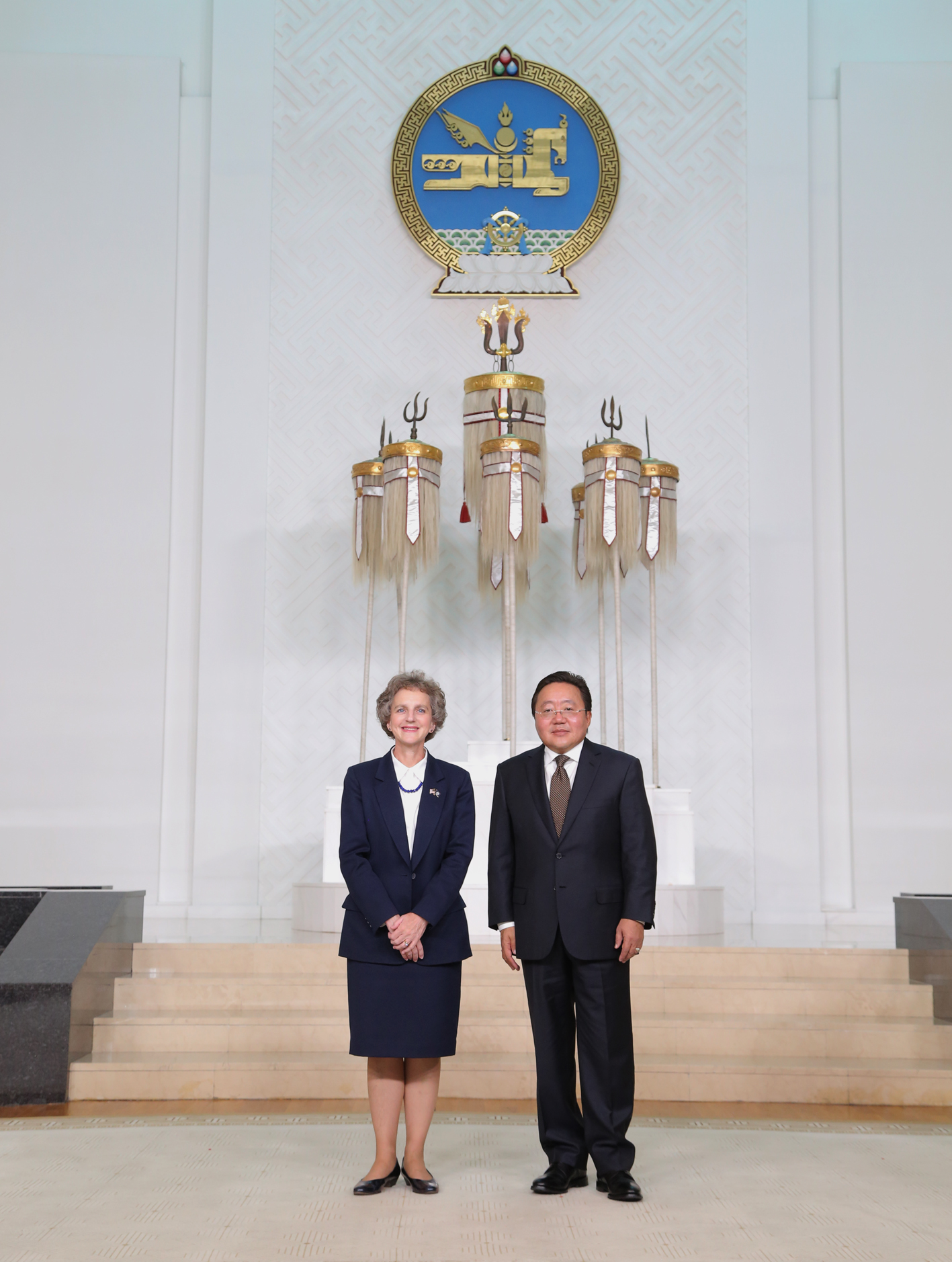 АНУ-аас Монгол Улсад суух Онц бөгөөд Бүрэн эрхт Элчин сайд хатагтай Женифер Зимдал Галт өнөөдөр Монгол Улсын Ерөнхийлөгч Ц.Элбэгдоржид Итгэмжлэх жуух бичгээ барив.