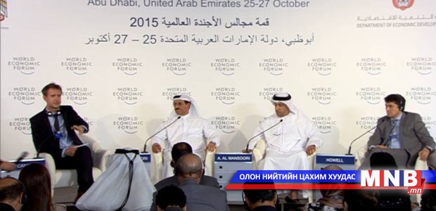 Арабын Нэгдсэн Эмират Улсын нийслэл Абу Даби хотноо 2015 оны энэ сарын 24-27-ны өдрүүдэд болж буй Дэлхийн эдийн засгийн форумын чуулга уулзалтын албан ёсны нээлт өнөөдөр болж байна. Уг форумд Монгол Улсаас Ерөнхийлөгчийн Тамгын газрын дарга П.Цагаан, УИХ-ын гишүүн, НҮБ-ын Байгаль орчны Ассамблейн Ерөнхийлөгч С.Оюун нар оролцож байгаа бөгөөд тэд Дэлхийн эдийн засгийн форумын Уул уурхай, төмөрлөг, усны зөвлөлийн салбар хуралдаанд оролцож байгаа юм.