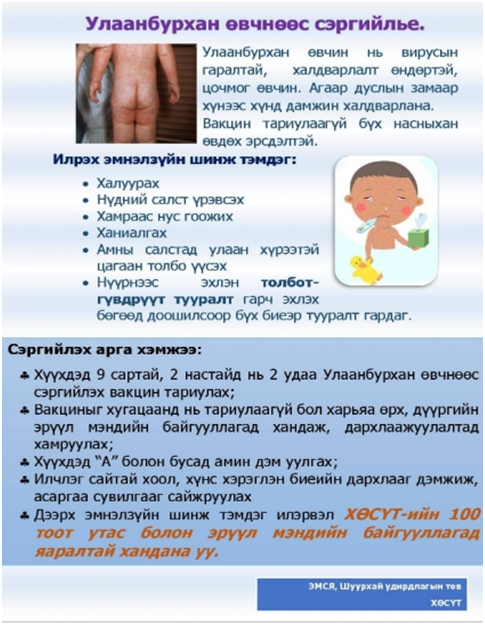 Сүүлийн 4-5 долоо хоногийн хугацаанд халууралт тууралттай шинж тэмдэг бүхий өвчин нэмэгдэж байна. Халууралт тууралттай шинж тэмдгээр илэрдэг халдварт өвчин бол улаанбурхан, улаан эсэргэнэ, улаанууд юм. Энэ онд дэгдэлт байдлаар гарч долоодугаар сараас буурах хандлагатай байсан улаанбурхан өвчин Сонгинохайрхан дүүрэгт 0-1 насны хүүхдийн дунд бүртгэгдэж, улаанбурхан, улаан эсэргэнэ оноштой эмчлүүлэгсэд нэмэгдэх хандлагатай байна. Тиймээс улаанбурхан өвчнөөс сэрэмжлүүлэх зөвлөмжийг иргэдэд, ялангуяа бага насны хүүхэдтэй эцэг, эхчүүдэд зориулан хүргэж байна.