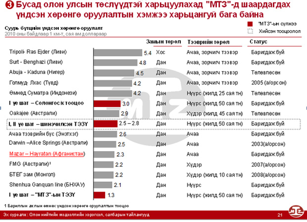 Харьцуулахад бүх юм ойлгогддог гэдэг зарчим байдаг. Энэ зарчмыг ТЭЗҮ бүтээгчид сайн ойлгож байсан. Тэгэхээр өөрсдийн барих төмөр замын өртгийг дэлхий дээр байдаг л үнэ гэдгийг бидэнд ойлгуулах хэрэгтэй байлаа. Үүний тулд яах вэ? Бусад баригдсан төмөр замуудтай харьцуулна. Хамгийн үнэтэй төмөр зам барьж болохгүй. Тэгэхээр хүн итгэхгүй. Хамгийн хямдыг барьж болохгүй. Тэгвэл өөрсдийгээ гомдооно. Өөрсдийнхөө халаасыг мартдаг хүн, тэр тусмаа улстөрчдийг үзсэн үү? За тэгээд тэд нэг ийм харьцуулсан хүснэгт гаргаж ирлээ.