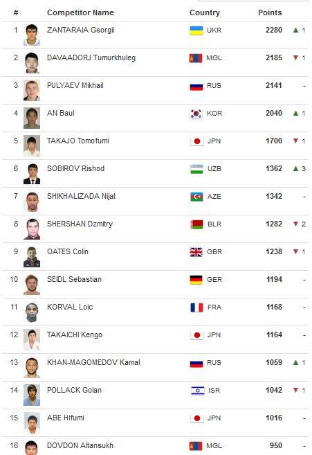 Харин гуравдугаарт манай оронд бэлтгэлээ базааж буй ДАШТ-ий хошой мөнгөтэй ОХУ-ын Михайл Пульяев бичигдэж байгаа бол шинэхэн дэлхийн аварга Ан Баул /БНСУ/ Абу Дабид түрүүлснээр 2000 онооны босгыг давж, Японы Томофүми Такажог ардаа орхисон байна. Мөн энэ оны ДАШТ-ий хүрэл медальтай Узбекистаны Ришод Собиров Абу Дабигаас хүрэл медаль хүртсэнээр чансаагаа гурван байраар ахиулсан байна. Харин энэ онд оролцсон тэмцээн бүрээсээ медаль хүртэж буй ОУХМ Д.Алтансүх 950 оноотой чансааны 16 дугаар байрт бичигджээ.