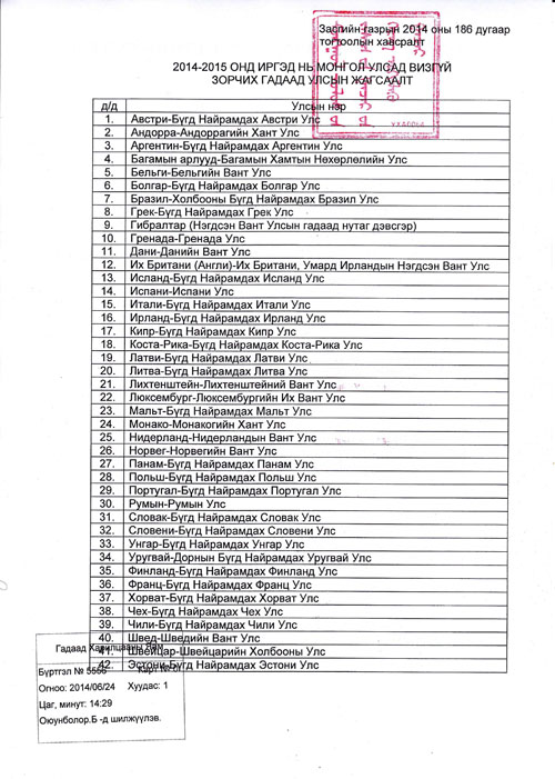 Монгол Улсын Гадаад хэргийн яам 2016 оны нэгдүгээр сарын 1-ний өдрөөс эхлэн 42 орны иргэдийг буцаан визтэй зорчуулах болсон талаар мэдэгдэв.