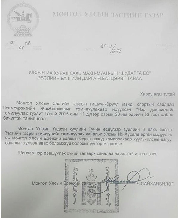 Харин өнгөрсөн долоо хоногт “Шударга ёс” эвслийн бүлгээс Эрүүл мэнд, спортын сайдад доктор Л.Жамбалжавыг нэр дэвшүүлж буйгаа мэдэгдсэн. Гэсэн хэдий ч Ерөнхий сайд Ч.Сайханбилэг уг саналыг хүлээн авах боломжгүй гэдгээ мэдэгджээ. Учир нь сайдыг УИХ-д өргөн мэдүүлэх нь Ерөнхий сайдын бүрэн эрхэд хамаарах асуудал учраас ийнхүү хүлээн авах боломжгүй гэж үзжээ.