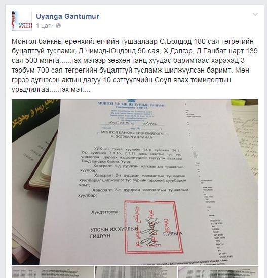 Энэ асуудалтай холбоотойгоор Монголбанкны удирдлагууд тус банкинд ажилладаг байсан н.Чулуунбат гэдэг залууг Г.Уянга гишүүнд дээрх мэдээллийг дамжуулсан гэж үзэн ажлаас нь халсан аж. Улмаар мэдээлэл нууцаар дамжуулсан гэх үндэслэлээр эрүүгийн хэрэг үүсгээд байгаа юм байна. Тиймээс н.Чулуунбат Г.Уянга гишүүнд захидал бичиж өөрийг нь энэ хэрэгт ямар ч холбоогүй гэдгийг нотолж өгөхийг хүссэн байна.