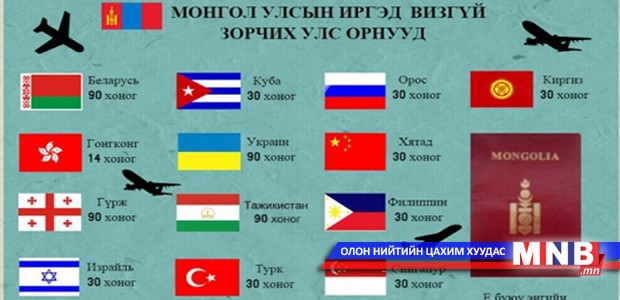 Манай улсын иргэд визгүй зорчиж болох орнуудын жагсаалтыг танилцуулж байна.