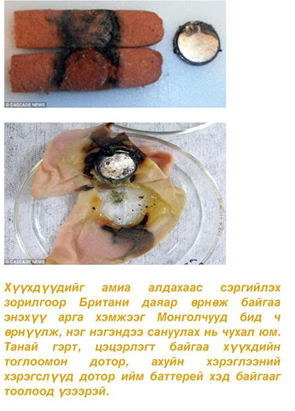 Их Британи улсад тоглоомонд байдаг товчин баттерейг залгиснаас болж хоёр хүүхэд амиа алдаж, таван хүүхэд насан туршийн согогтой болсон хэрэг өнгөрөгч онд гарсан. Үүнтэй холбогдуулан тус улсаас иргэдийнхээ сонор сэрэмжийг нэмэгдүүлэх зорилгоор шат дараатай арга хэмжээ зохион байгуулж байгаагийн нэг нь баттерей залгисны дараа ямар зүйл болдгийг харуулсан зурагт хуудас болоод бичлэг юм. Үүнийгээ Британийн эмч нар зайдсан дээр жишээ болгон харуулжээ. Товчин баттерей хүүхдийн хоолойд тээглэсэн бол хоёр цагийн дотор л цус алдалтад хүргэдэг байна.