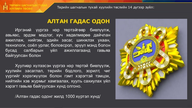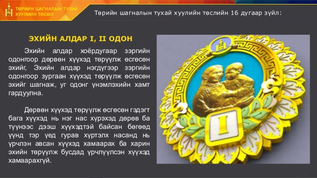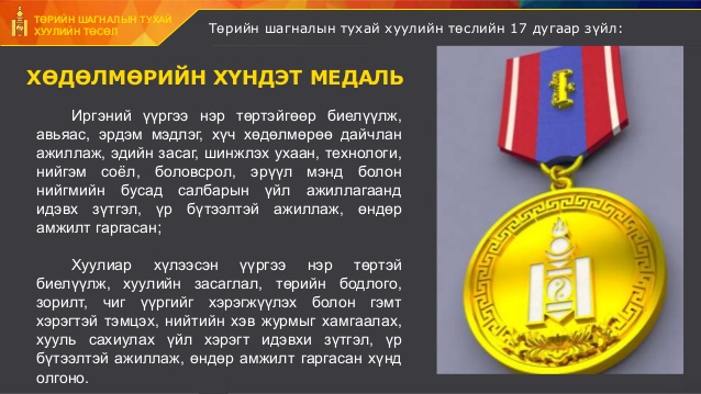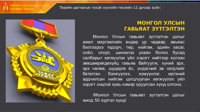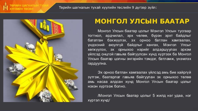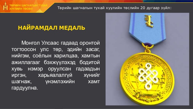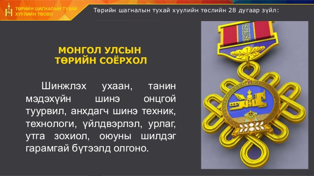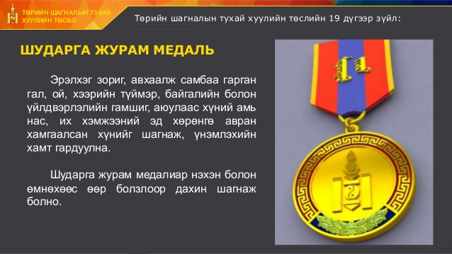 - “Монгол Улсын Төрийн шагналын дүрэм”-ээр тус тус зохицуулж байна.