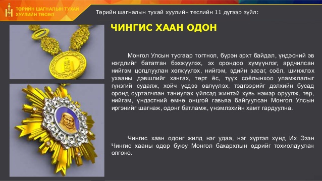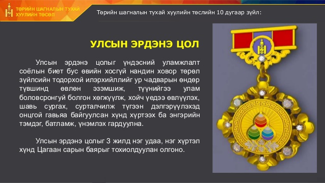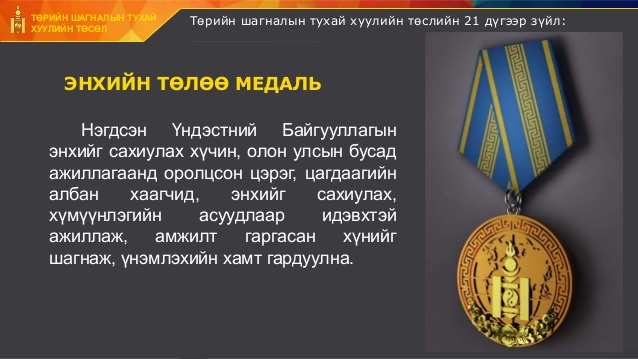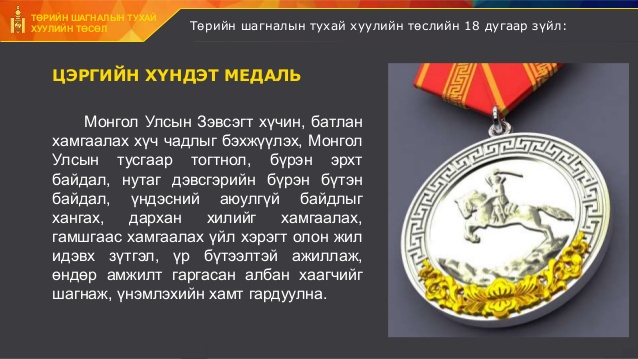 - Монгол Улсын Ерөнхийлөгчийн 1999 оны 71 дүгээр зарлигаар батлагдсан “Монгол Улсын цол хүртээх, одон, медалиар шагнах журам”