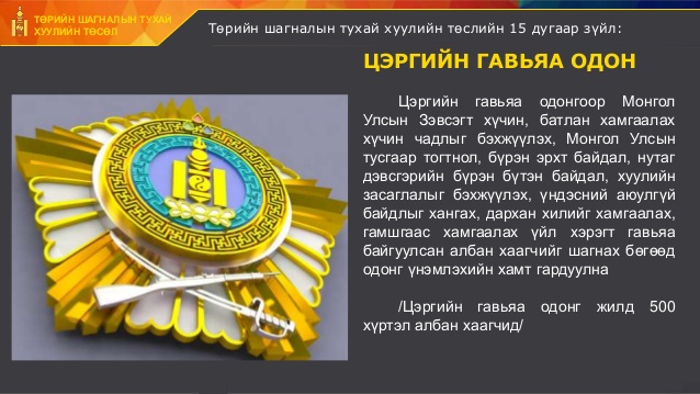 Түүнчлэн улсын цол, одон, медаль, цэргийн дээд цолыг бий болгох асуудал нь УИХ-ын онцгой бүрэн эрхэд хамаардаг. Энэ мэт нэгдсэн зохицуулалтгүй байдлыг цэгцлэх, шагналын талаар төрөөс баримтлах нэгдсэн бодлогыг Үндсэн хуульд нийцүүлэх мөн төрийн шагналтай холбогдон үүсэж буй нийгмийн харилцааг зохицуулах зорилгоор энэхүү хуулийн төслийг боловсруулсан байна.