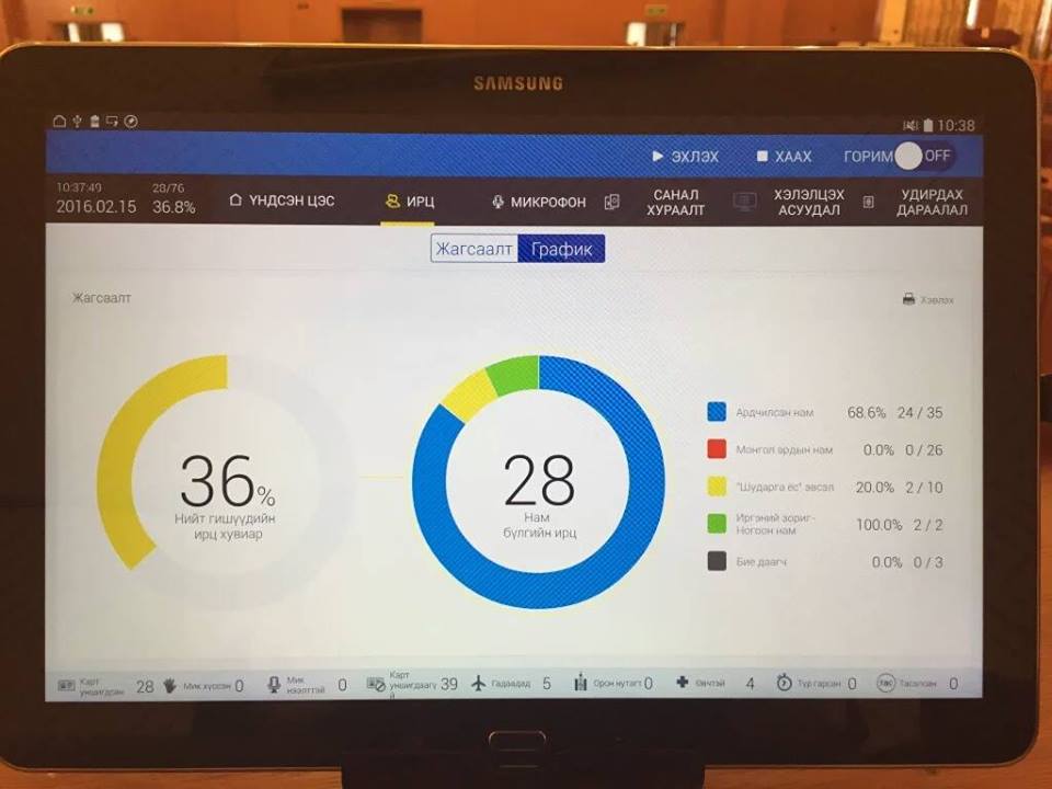 Чуулганы нэгдсэн хуралдааны ирцийн мэдээллийг 10:30 цагийн байдлаар ямар байсныг үзүүлье.