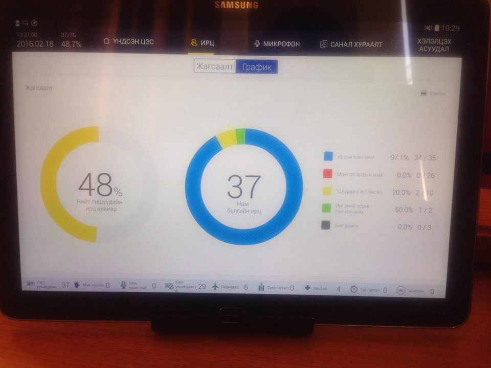 Хуралдааны ирцийг танилцуулахад, 11:00 цагийн байдлаар 48.7 хувь буюу 37 гишүүн ирээд байсан юм. Тодруулбал, Ардчилсан намаас 34, “Шударга ёс” эвслээс М.Сономпил, Н.Батцэрэг нар, ИЗНН-аас С.Дэмбэрэл гишүүн иржээ. АН-ын бүлгийн гишүүн Б.Бат-Эрдэнэ, ИЗНН-ын гишүүн С.Оюун нар гадаадад томилолттой яваа аж.