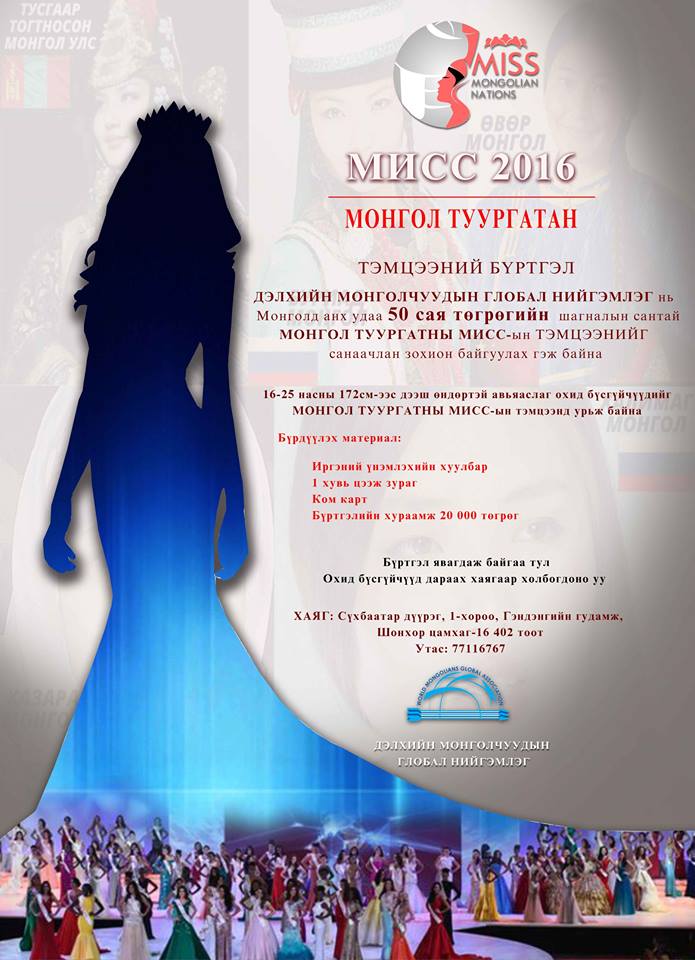 “Дэлхийн Монголчуудын Глобал” нийгэмлэгээс ирэх сарын 3-28-ны өдрүүдэд Улаанбаатар хотноо “Монгол туургатны мисс 2016” тэмцээнийг зохион байгуулахаар болжээ. Тус тэмцээний шагналын сан 50 сая төгрөг бөгөөд тэргүүн мисс болсон бүсгүйг “Hyundai Sonata 7” автомашинаар мялаах юм.
