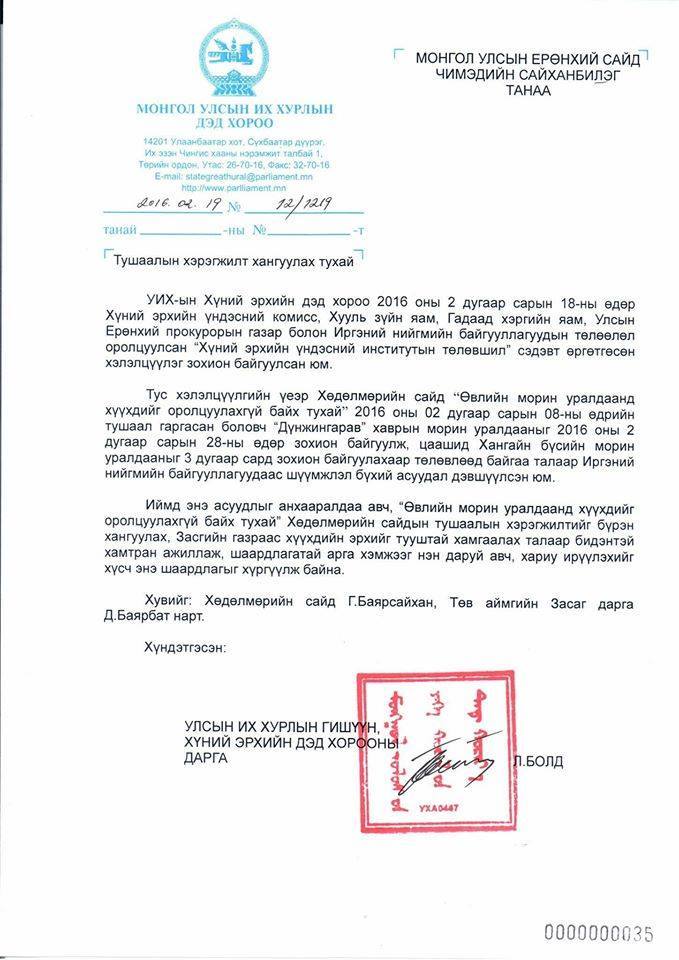 Тус албан бичигт энэ сарын наймны өдөр Хөдөлмөрийн сайдын тушаалаар батлагдсан “Өвлийн морин уралдаанд хүүхдийг оролцуулахгүй байх тухай” тушаалыг хэрэгжүүлэхийг хүссэн байна. Өөрөөр хэлбэл, “Дүнжингарав-2016” уралдаан болон ирэх гуравдугаар сард болон Хангайн бүсийн морин уралдаанд хүүхэд оролцуулахгүй байх, хүүхдийн эрхийг хамгаалах асуудалд анхаарч ажиллахыг хүсчээ.