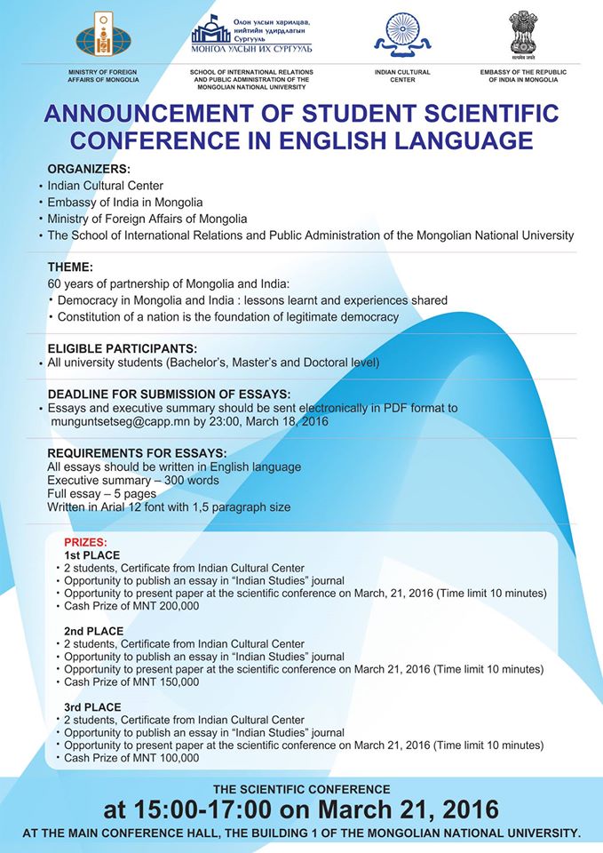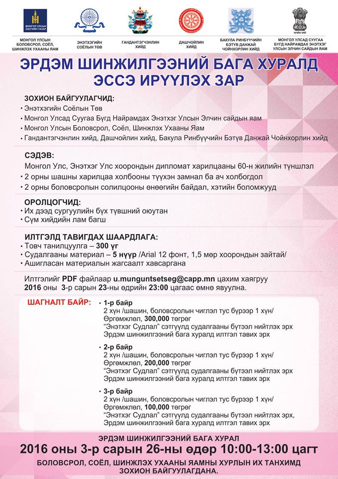 БСШУЯ, Монгол Улсад суугаа Бүгд найрамдах Энэтхэг улсын элчин сайдын яам, Энэтхэгийн соёлын төв, Гандантэгчэнлин хийд хамтран "Монгол, Энэтхэгийн дипломат харилцааны 60-н жилийн түншлэл" эссэ бичлэгийн уралдаан зарлалаа. Уралдаанд их, дээд сургуулийн оюутнууд болоод сүм хийдийн лам, багш нар оролцох боломжтой бөгөөд эссэг энэ сарын 23-ныг хүртэл хүлээж авах ажээ.