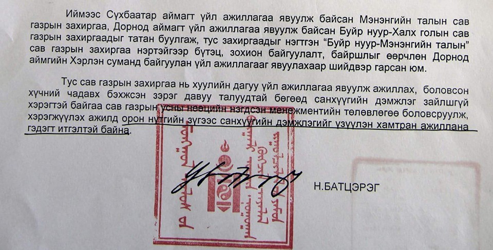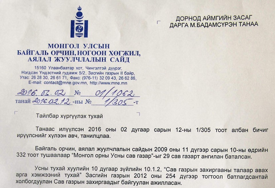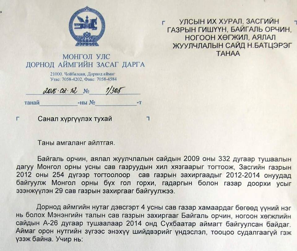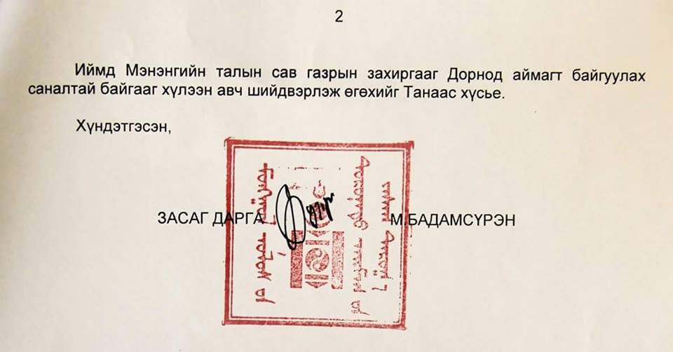 БОНХАЖ-ын сайд Н.Батцэрэг "Мэнэнгийн талын сав газрын захиргааг Дорнод аймагт байгуулах" шийдвэрийг энэ сарын 2-нд гаргасан байна. Дээрх хүсэлтийг Дорнод аймгийн Засаг дарга М.Бадамсүрэн БОНХАЖ-ын сайдад хоёрдугаар сарын 12-ны өдөр хүргүүлжээ. Албан бичгийг хавсралтаар нийтлэв.