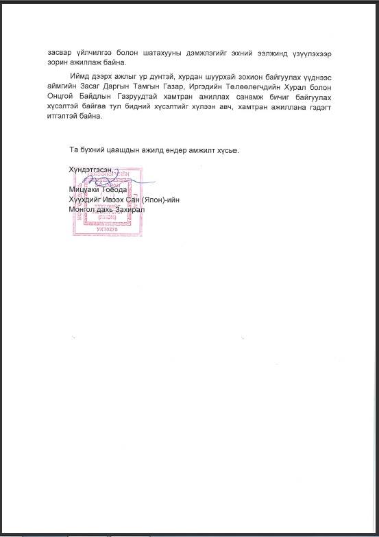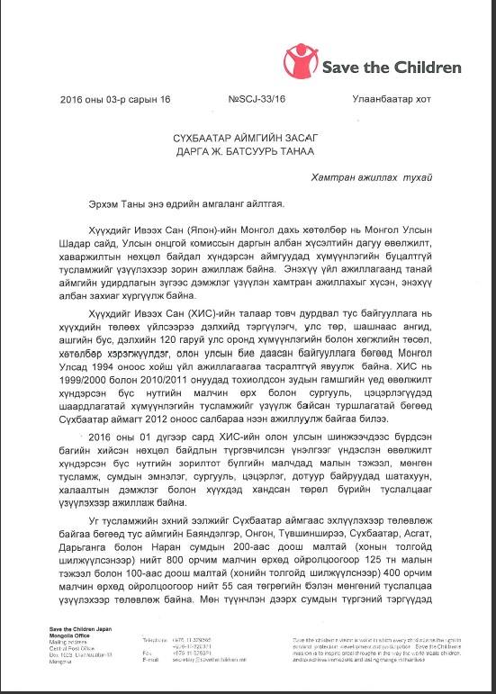 Дараах зурагт Японы Хүүхдийг ивээх сангаас Сүхбаатар аймгийн Засаг дарга Ж.Батсуурьт хүргүүлсэн баримт бичгийг дэлгэрүүлж нийтлэв.