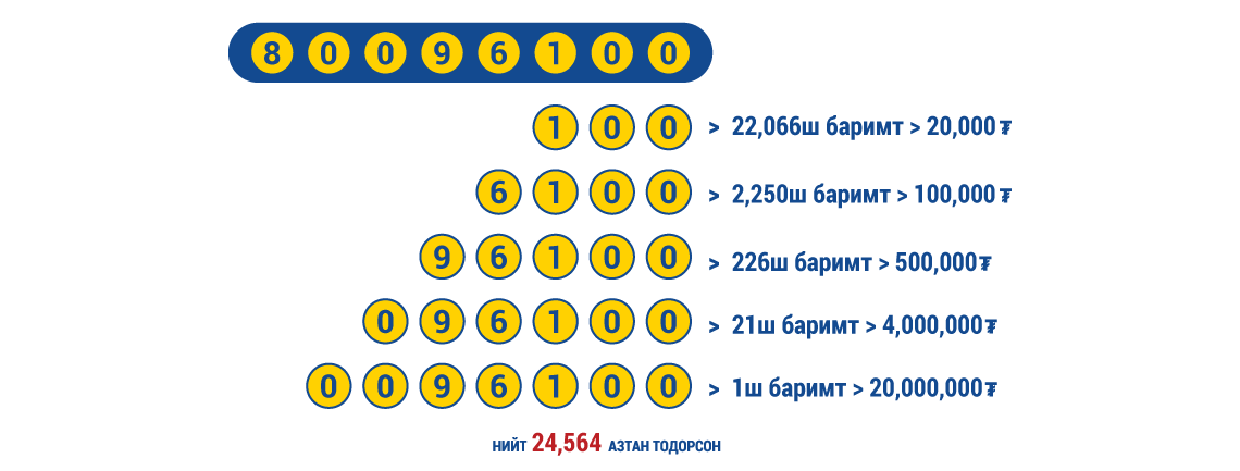 Үүнээс гадна 20 сая төгрөг хожсон нэг азтан шалгарсан бол 4 сая төгрөг хожсон 21 баримт, 500 мянган төгрөгт 226 ширхэг баримт тохирчээ.