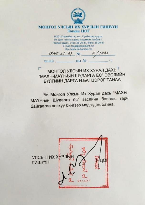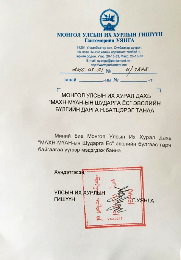 | Г.Уянга, Л.Цог нар Эвслийн бүлгээс гарах бичиг хүргүүлжээ | ||