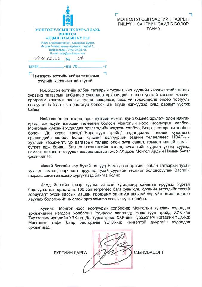УИХ дахь МАН-ын бүлгээс Нэмэгдсэн өртгийн албан татварын тухай шинэ хуулийн хэрэгжилттэй холбогдуулан аж ахуйн нэгжүүдийг торгохгүй байхыг хүссэн албан тоотыг Сангийн сайд Б.Болорт илгээжээ.