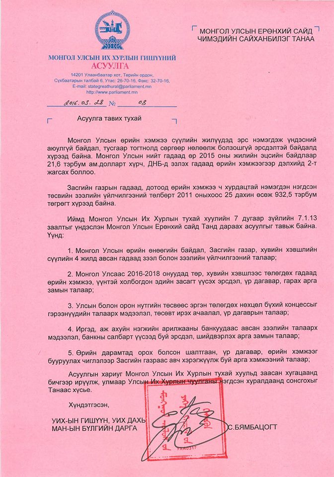 УИХ-ын гишүүн С.Бямбацогт өр, зээлийн асуудлаар Ерөнхий сайд Ч.Сайханбилэгт таван зүйл бүхий асуулга тавьжээ. Асуулгад "Монгол Улсын өрийн хэмжээ сүүлийн жилүүдэд эрс нэмэгдэж үндэсний аюулгүй байдал, тусгаар тогтнолд сөргөөр нөлөөлж болзошгүй эрсдэлтэй байдалд хүрээд байна. Монгол Улсын нийт гадаад өр 2015 оны жилийн эцсийн байдлаар 21.6 тэрбум ам.долларт хүрч, ДНБ-д эзлэх гадаад өрийн хэмжээгээр дэлхийд хоёрдугаарт жагсах боллоо. Засгийн газрын гадаад, дотоод өрийн хэмжээ хурдацтай нэмэгдэн нэгдсэн төсвийн зээлийн үйлчилгээний төлбөрт 2011 оныхоос 25 дахин өсөж 932.5 тэрбум төгрөгт хүрээд байна" гэжээ.