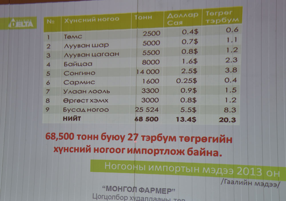 Монгол Улс жилдээ 68.500 тонн буюу 27 тэрбум төгрөгийн хүнсний ногоог импортлож байна. “Дельта холдинг” ХХК олон улсын эрүүл ахуйн стандартыг хангасан тээвэрлэлт, хадгалалт, түгээлтийн иж бүрэн системийг бүрдүүлэх замаар хэрэглэгчийн эрэлт хэрэгцээг дээд зэргээр хангахуйц орчин үеийн жишиг цогцолбор ложистик төв байгуулах төслийг хэрэгжүүлж байна. Энэ төслийн талаар тус компанийн гүйцэтгэх захирал Ц.Ганбат Улсын Их Хурлын даргад танилцуулав. Хоёр үе шаттай хэрэгжүүлж буй уг төсөл эхний ээлжинд 1000 тн-ын багтаамжтай махны хөргүүртэй зоорь, 1200 тонн-ын багтаамжтай жимс, хүнсний ногооны хөргүүрийг шаардлагатай иж бүрэн дэд бүтцийн хамт ашиглалтад оруулжээ. Ингэснээр 14 ажлын байрыг шинээр бий болгосон бөгөөд төслийн дараагийн шатыг хэрэгжүүлж дуусахад 24 шууд ажлын байр, шууд бусаар 1000-2000 орчим ажлын байрыг бий болгох тооцоолол гаргажээ.