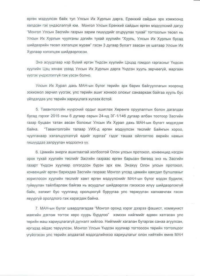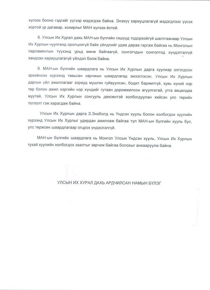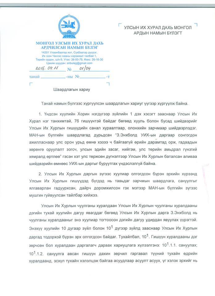 Өнгөрсөн долоо хоногт УИХ дахь МАН-ын бүлгээс УИХ-ын дарга З.Энхболдыг сайн дураараа албан тушаалаасаа татгалзах ёстой гэсэн шаардлагыг хүргүүлсэн. Харин уг шаардлагад өнөөдөр УИХ дахь АН-ын бүлгээс хариу илгээжээ. Хариуг бүрэн эхээр нь хүргэж байна.