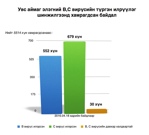 Увс аймагт “Эрүүл элэг” хөтөлбөр хэрэгжиж эхэлсэнтэй холбогдуулан аймгийн бүх насанд хүрэгчдийг элэгний В, С вирусын түргэвчилсэн шинжилгээнд хамруулах ажлыг энэ сарын 11-18-ныг хүртэл зохион байгуулжээ. Шинжилгээнд нНийт 5514 хүн хамрагдсан байна. Урьдчилсан дүнгээс харахад шинжилгээнд хамрагдсан хүний 552 нь В вирустай, 679 нь С вирустай гэж оношлогджээ. Түүнчлэн В, С вирусын давхар халдвартай гарсан хүн ч байгаа аж.