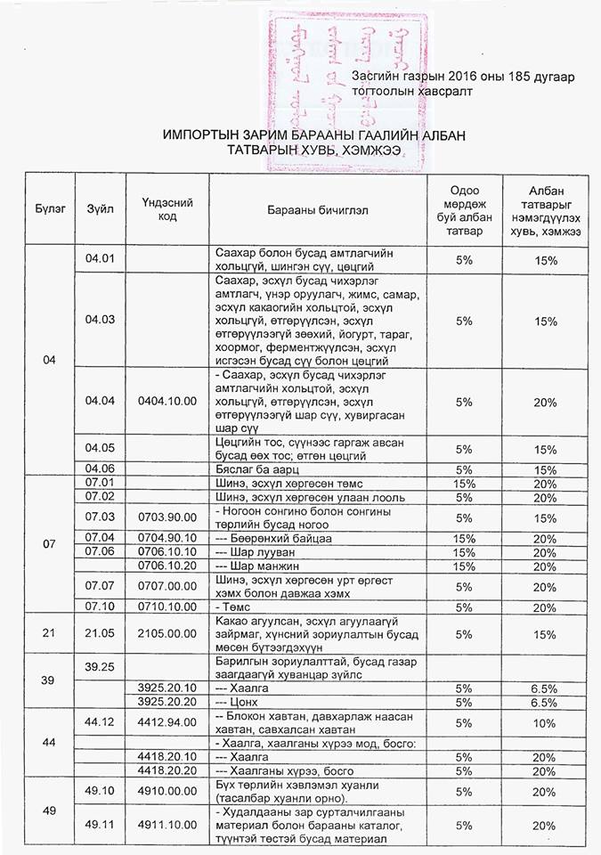 Өчигдрөөс эхлэн импортын 100 гаруй нэр төрлийн барааны гаалийн татварын хэмжээ нэмэгдэж байна. Тодруулбал, Засгийн газраас 185 дугаар тогтоол баталж, импортын 14 бүлгийн 28 зүйлийн 100 гаруй нэр төрлийн бараарны гаалийн татварын хувь хэмжээг 5-20 хүртэлх хувиар нэмэгдүүлэх шийдвэр гаргасан.