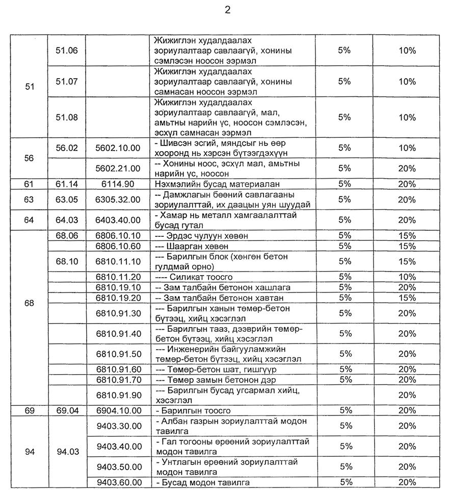Ингэснээр дотоодын үйлдвэрлэл болон борлуулалтыг дэмжих чухал алхам болж байгаа хэмээн үзэж байгаа юм. Уншигч та бүхэнд татвар нэмэгдүүлсэн барааны жагсаалтыг танилцуулж байна.