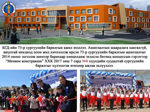 БГД-ийн 73 дугаар сургуулийн барилгын ажил эхэллээ. Ашиглалтын шаардлага хангахгүй, аюултай нөхцөлд олон жил хичээллэж ирсэн 73 дугаар сургуулийн барилгын ашиглалтыг 2014 оноос зогсоож шинээр барихаар хөөцөлдөж эхэлсэн бөгөөд концессын гэрээгээр "Монкон констракшн" ХХК барьж байгуулахаар болсон байна.