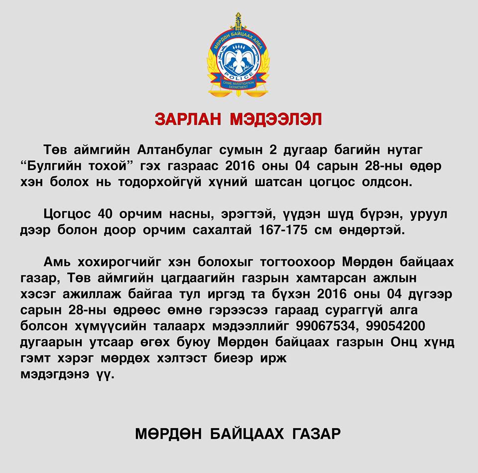 Энэ талаар ЦЕГ-ын Хэвлэл мэдээллийн төвийн ахлах мэргэжилтэн Ё.Лхагвасүрэн "Хэргийн газар цогцсыг хэзээ авчирч шатаасныг тогтоохоор биечилсэн сурвалжлага явуулахад 2016 оны гуравдугаар сарын 16-ны өдөр цогцос уг газарт зүүн гар нь байхгүй, шатсан байдалтай байсныг Хан-Уул дүүргийн 13 дугаар хороо “Шувуун фабрик”-д оршин суух хаягтай иргэн Д нь цагдаагийн байгууллагад мэдэгдсэн. Цогцос нь 40 орчим насны, эрэгтэй, үүдэн шүд бүрэн, уруул дээр болон доор оочин сахалтай, 167-175 см өндөртэй. Хохирогчийг хэн болохыг тогтоохоор Мөрдөн байцаах газар, Төв аймгийн цагдаагийн газрын хамтарсан ажлын хэсэг ажиллаж байгаа тул дөрөвдүгээр сарын 28-ны өдрөөс өмнө гэрээсээ гараад сураггүй болсон хүмүүсийн талаарх мэдээллийг 99067534, 99054200 дугаарын утсаар мэдэгдэх буюу Мөрдөн байцаах газар, Төв аймгийн цагдаагийн газарт биеэр ирж мэдэгдэнэ үү" гэлээ.