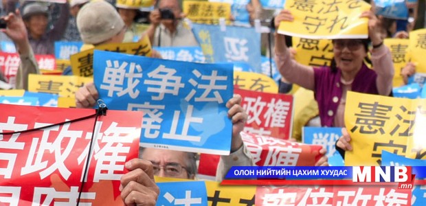 Японы Үндсэн хуулийн 9-р зүйлд нэмэлт өөрчлөлт оруулахыг эсэргүүцсэн жагсаал өчигдөр тус улсын нийслэл Токио хотноо зохион байгуулагдлаа. Дэлхийн Хоёрдугаар дайны дараа Японд шинэ Үндсэн хууль баталсны 69 жилийн ой өчигдөр тохиосон байна. Энэ ойтой давхцуулан Японы иргэд Үндсэн хуулийнхаа энх тайванч үзэл санааг хамгаалах жагсаал зохион байгуулжээ. Япон улсын Үндсэн хуульд тус улс өөрийн бүрэн эрх, тусгаар тогтнолд нь аюул занал учирснаас бусад тохиолдолд хилийн чанадад цэргийн ажиллагаа явуулахыг хориглосон байдаг юм.
