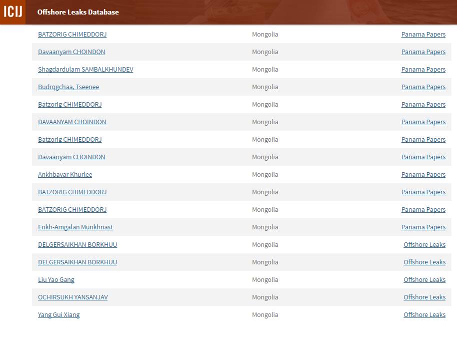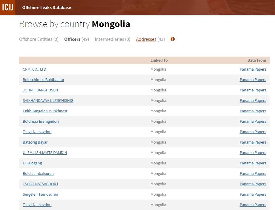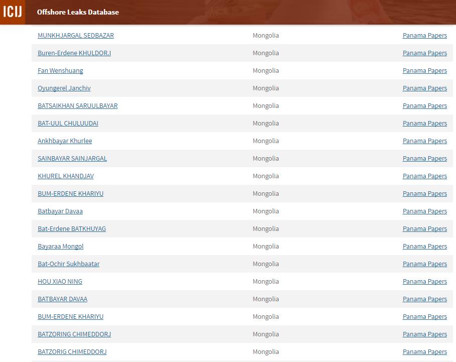 Өмнө нь манай улсаас 47 иргэний мэдээлэл Панамын материалууд дунд бий гэсэн яриа гарч байсан хэдий ч албан ёсоор Монгол Улсын 49 иргэн, компанийн нэр оффшор данстай гэж бүртгэгджээ.
