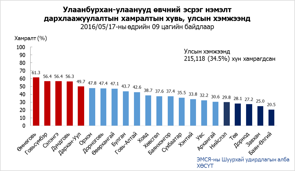 Тодруулбал, аймгуудын хувьд Өмнөговь аймагт нэмэлт дархлаажуулалтад хамрагдалт хамгийн өндөр буюу 61 хувьтай байгаа бол Баян-Өлгий аймагт хамгийн бага буюу 20 хувьтай байна.