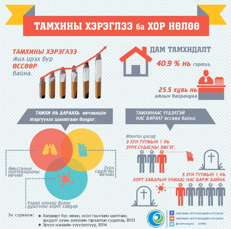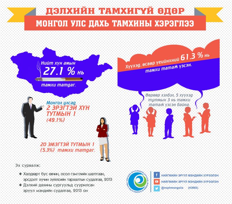 Энэ сарын 31-нд “Тамхины эсрэг өдөр” тохионо. Манай улсын нийт хүн амын 27.1 хувь нь тамхи татдаг гэсэн судалгаа бий. Түүнчлэн хоёр эрэгтэй хүн тутмын нэг нь тамхи татдаг бол 20 эмэгтэй тутмын нэг нь тамхи татдаг ажээ. Мөн өсвөр үеийнхний 61 хувь нь тамхи татаж үзсэн байдаг байна.
