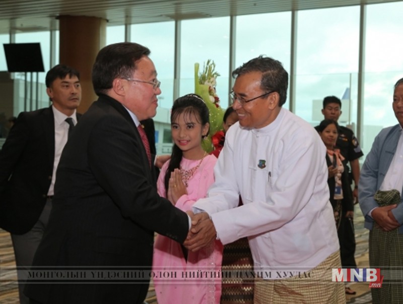 Монгол Улсын Ерөнхийлөгч Ц.Элбэгдорж Мьянмарын Холбооны Бүгд Найрамдах Улсад ажлын айлчлал хийхээр Нэйпидо хотноо хүрэлцэн очлоо. Монгол Улсын Ерөнхийлөгчийг Нэйпидо хотын олон улсын нисэх буудалд угтах үеэр Монгол Улсаас Мьянмарын Холбооны Бүгд Найрамдах Улсад суугаа Онц бөгөөд Бүрэн эрхт Элчин сайд Т.Төгсбилгүүн, Мьянмарын талаас Эрдэс баялаг, байгаль орчин хамгааллын сайд Он Вин, Гадаад харилцааны яамны Байнгын нарийн бичгийн дарга Аунг Линн, Гадаад харилцааны яамны Ёслолын газрын ерөнхий захирал Ко Ко Найнг, Гадаад харилцааны яамны Улс төрийн газрын захирал Кяав Зеяа нар байлцлаа.